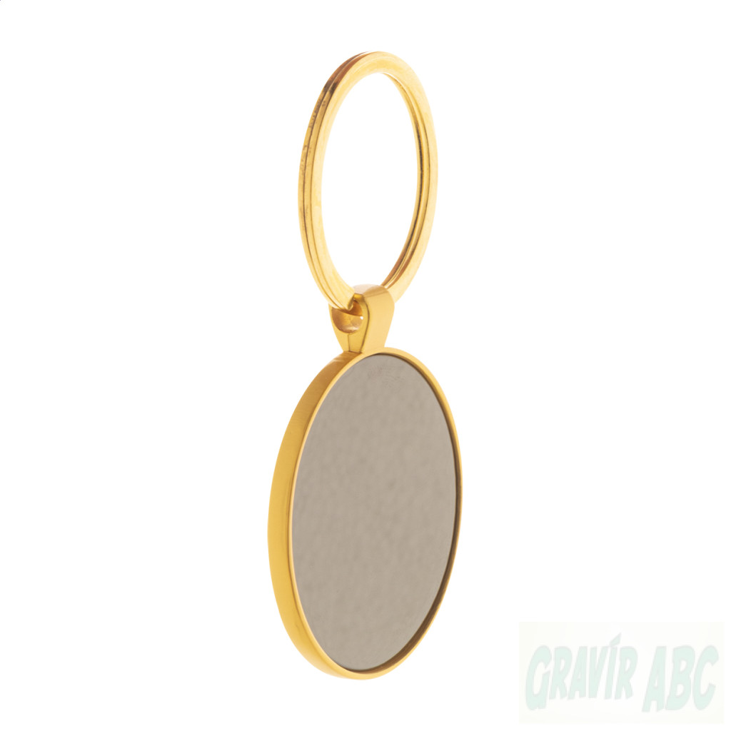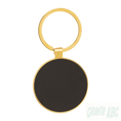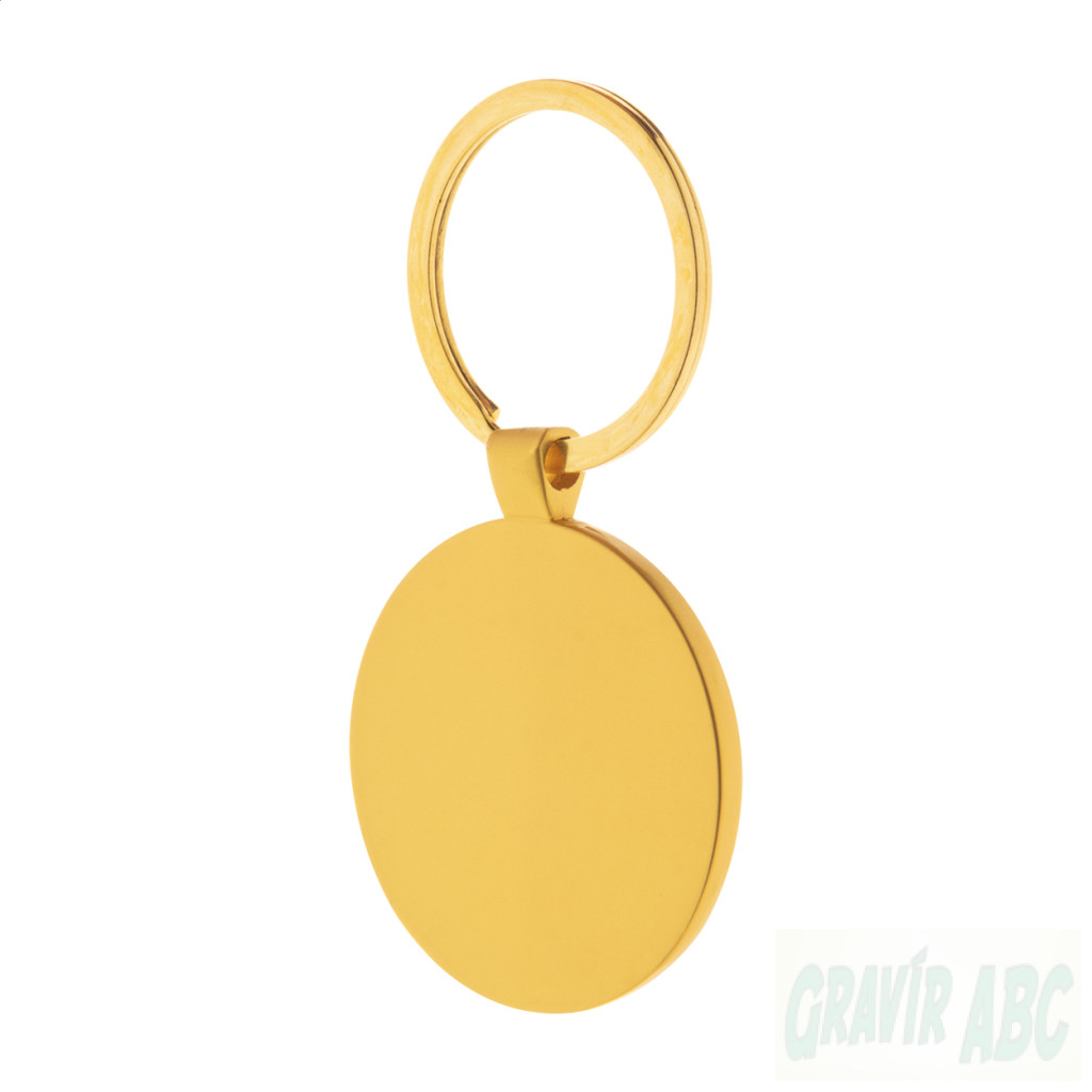 Kör alakú fém kulcstartó arany kivitelben, fegyverfém lemezzel. Kraft papír dobozban.