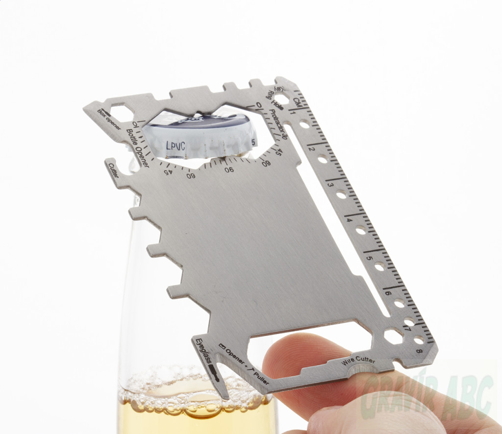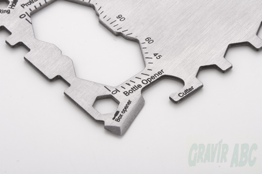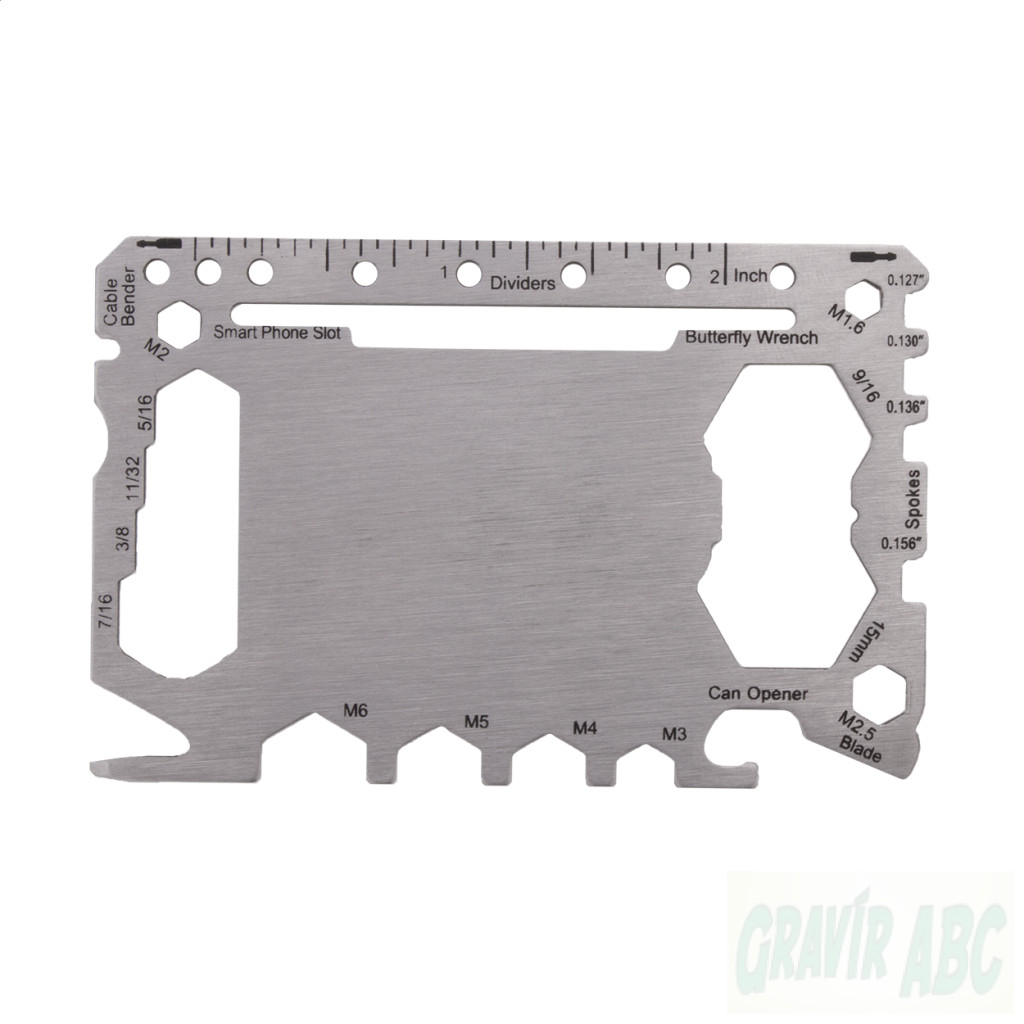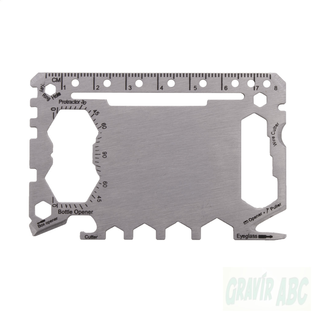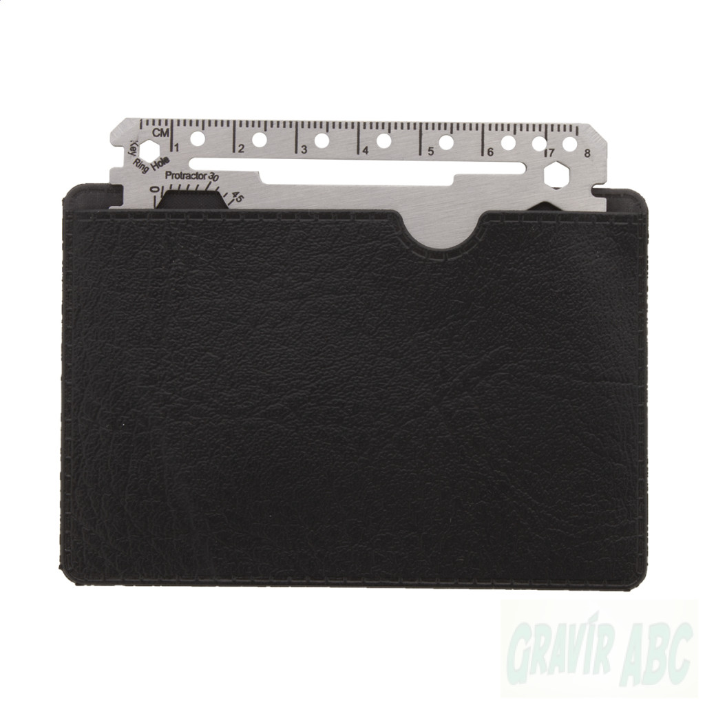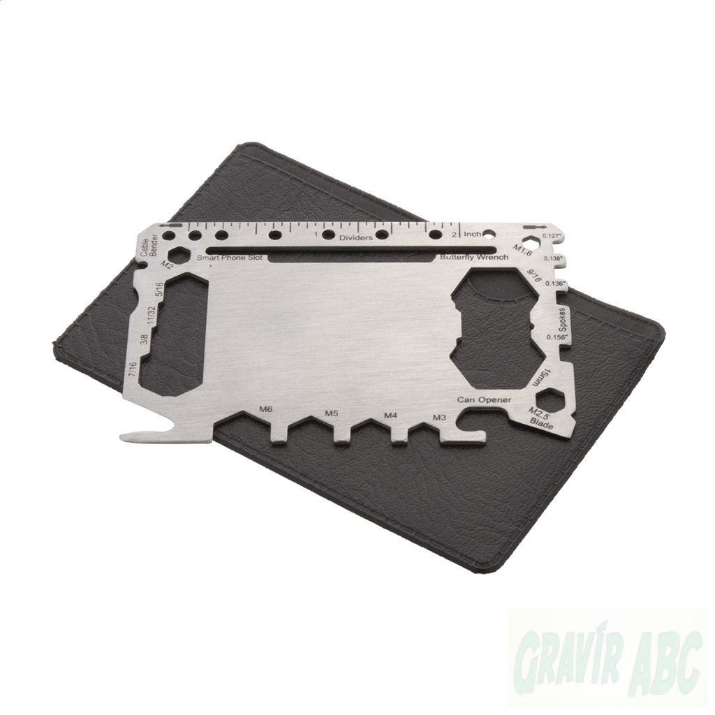 Rozsdamentes acélból készült, bankkártya formájú multiszerszám 20 funkcióval, PU bőr tokban.